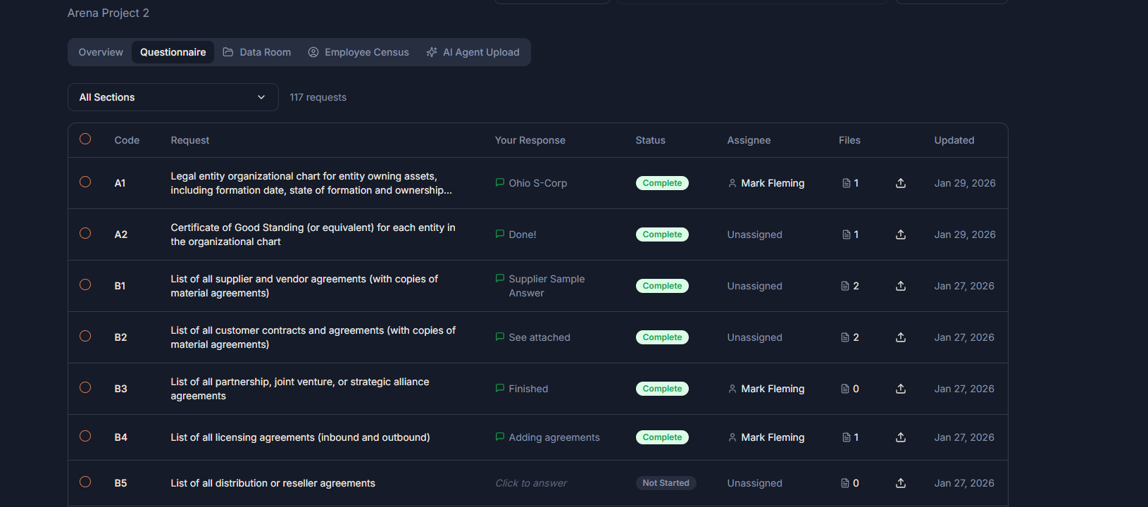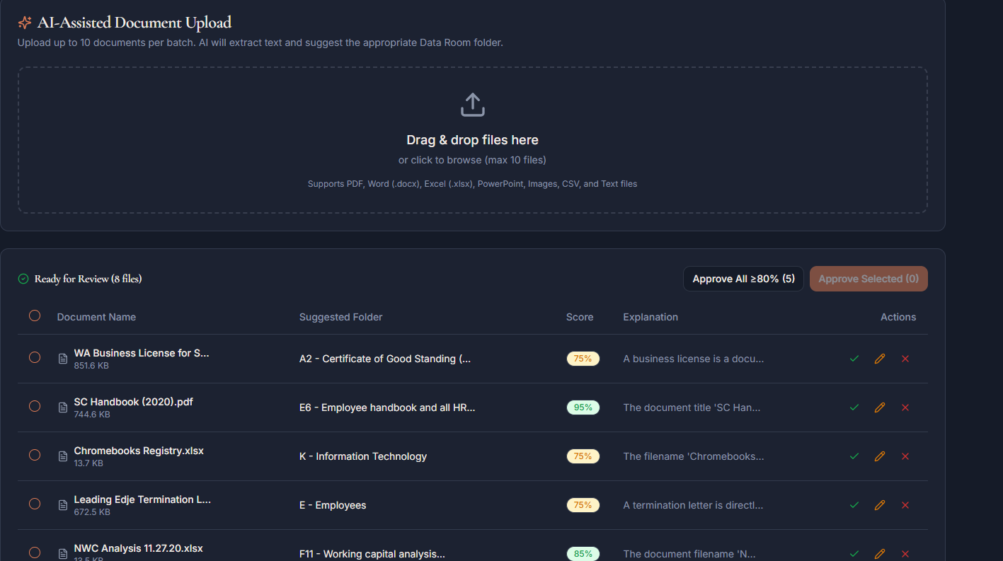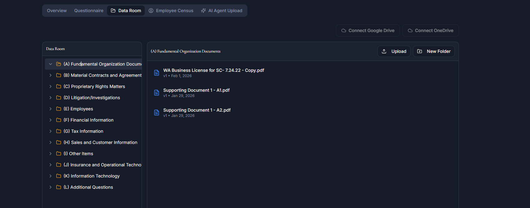 Use a real-world due diligence questionnaire and data room structure to organize your data. Includes an AI agent assistant to review uploaded files and auto-categorize for a simpler data migration.